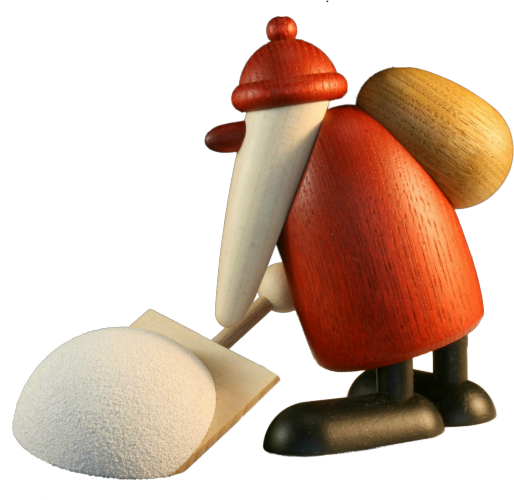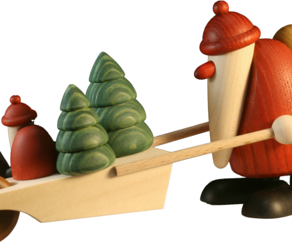 Weihnachtsmann mit Bäumen und Weihnachtskind auf einer Schubkarre