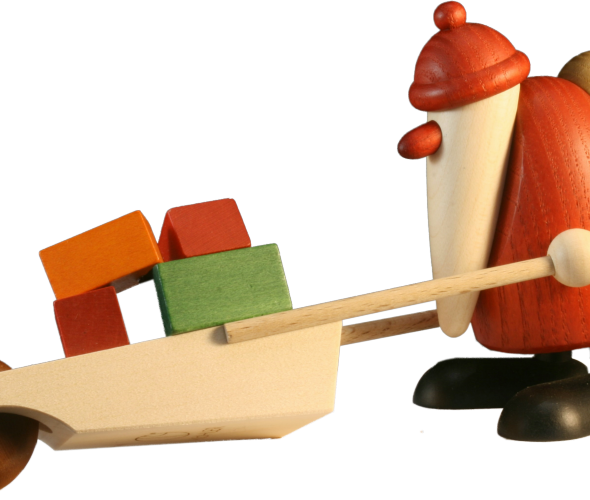 Weihnachtsmann mit Geschenken auf einer Schubkarre