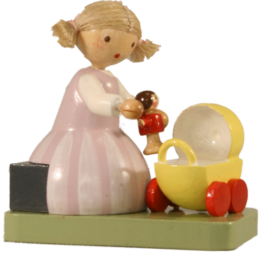 Mädchen mit Puppe und Wagen