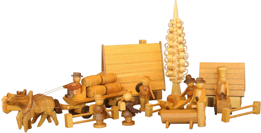 1 Haus, 1 Schulppen, 1 Wagen, 1 Baum, 3 Zäune, 1 Wassertrog, 6 Figuren